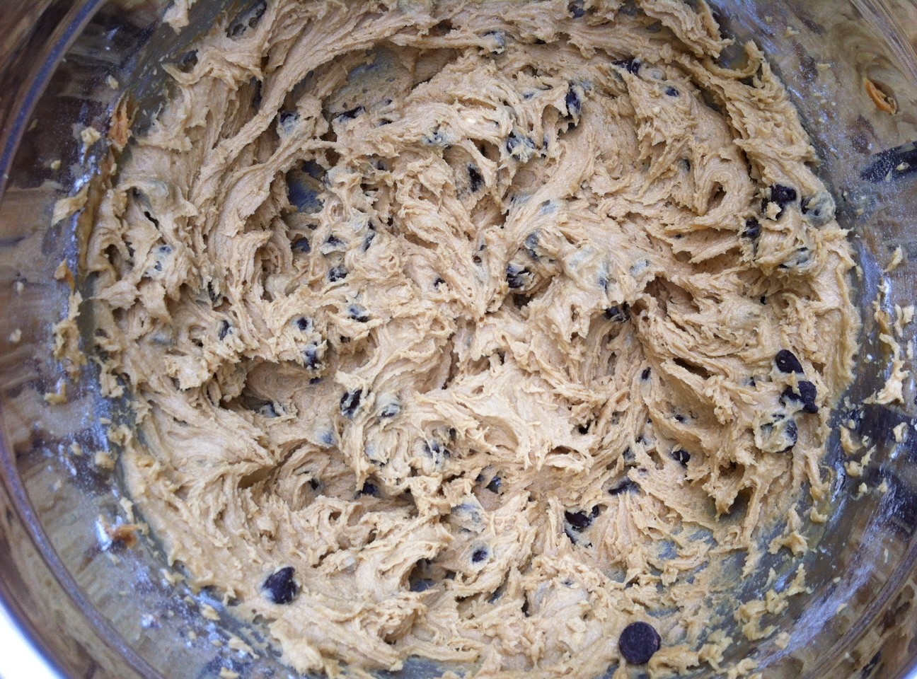 6. Reduce mixer to low speed and slowly add in the flour mixture. Add the chocolate chips, stirring until combined.