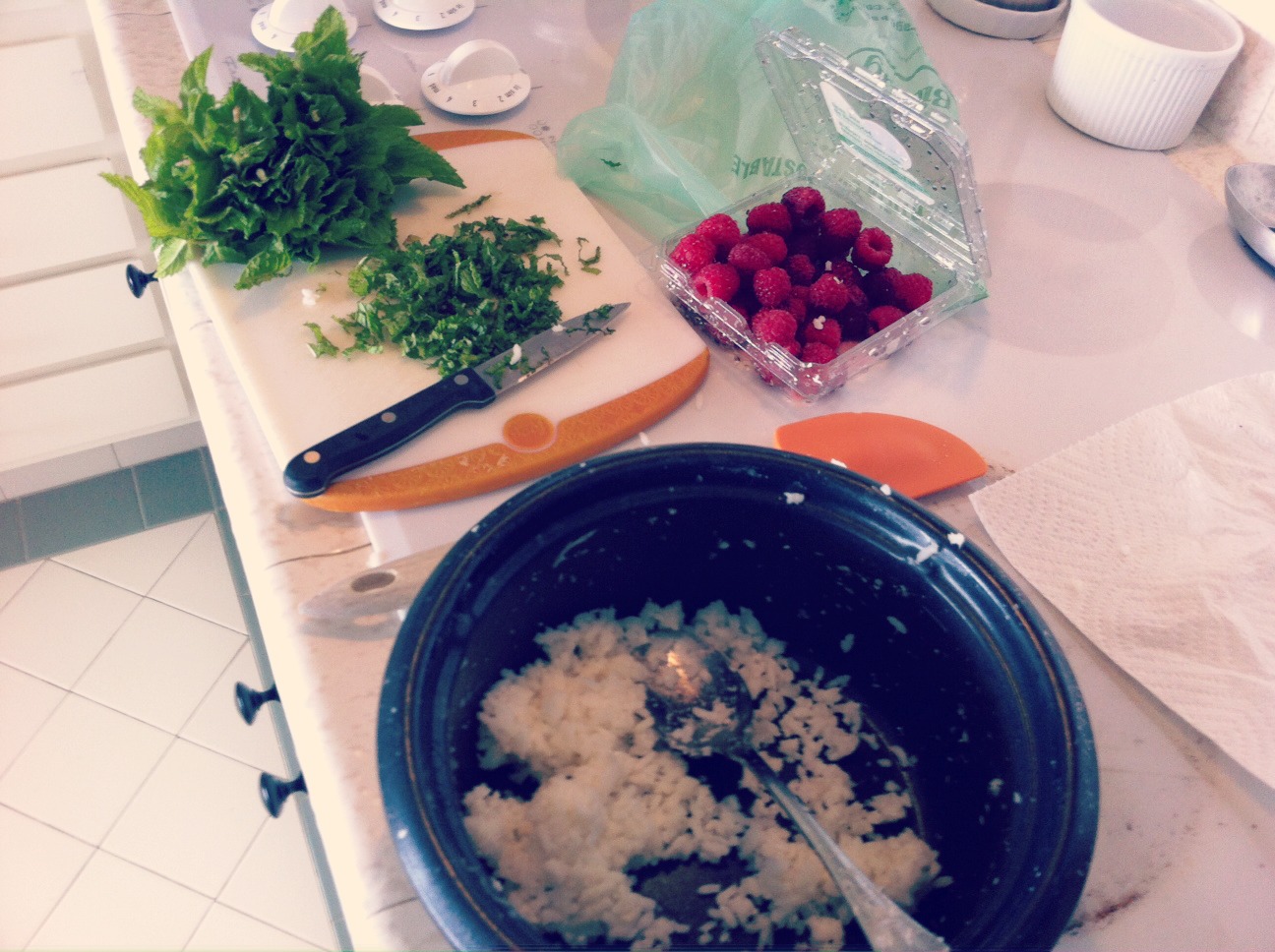 3. Coat hands in olive oil, and place a spoonful of rice in the palm of one hand. Place a raspberry and a sprinkle of mint on top of rice, and then place another spoonful of rice over that (to encase raspberry and mint in rice). Roll gently between palms to form a ball.