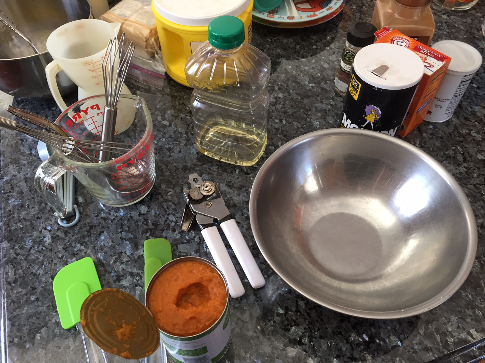 Step one: Gather all your ingredients. As you can see, we were low on vegetable oil, so I just substituted coconut oil instead.