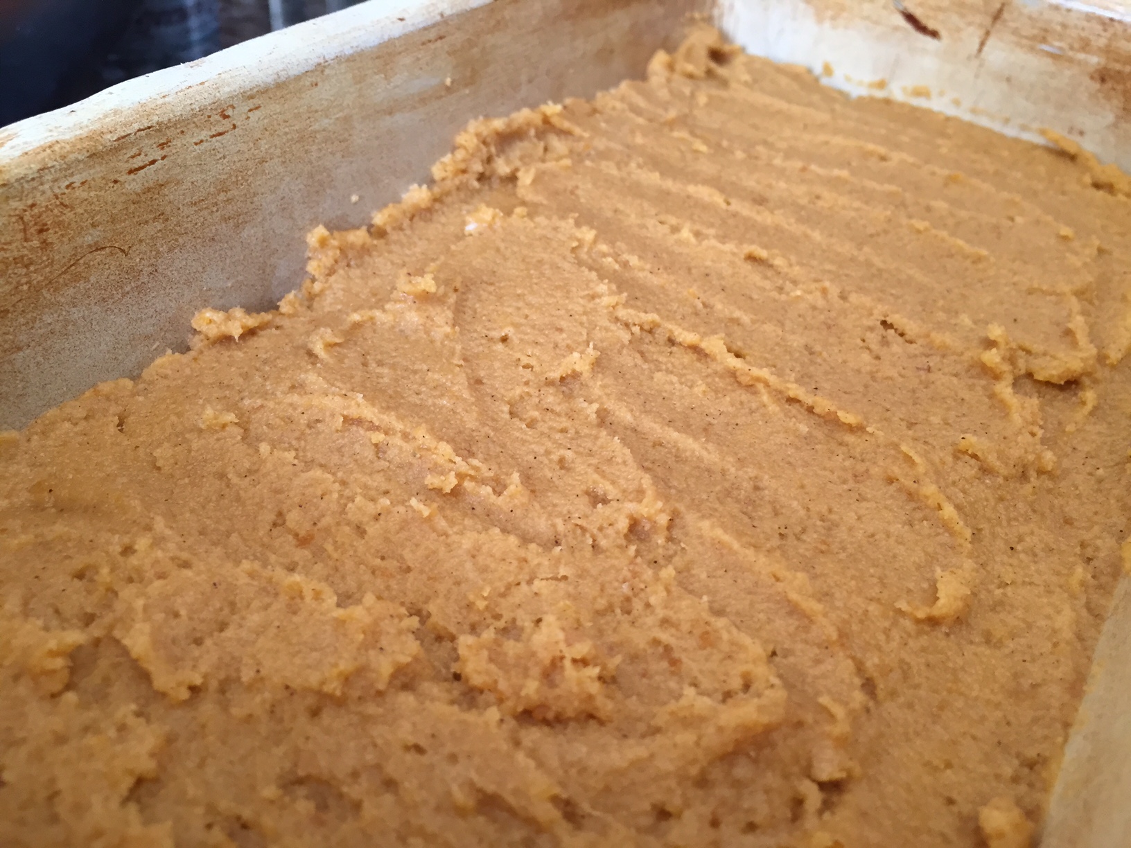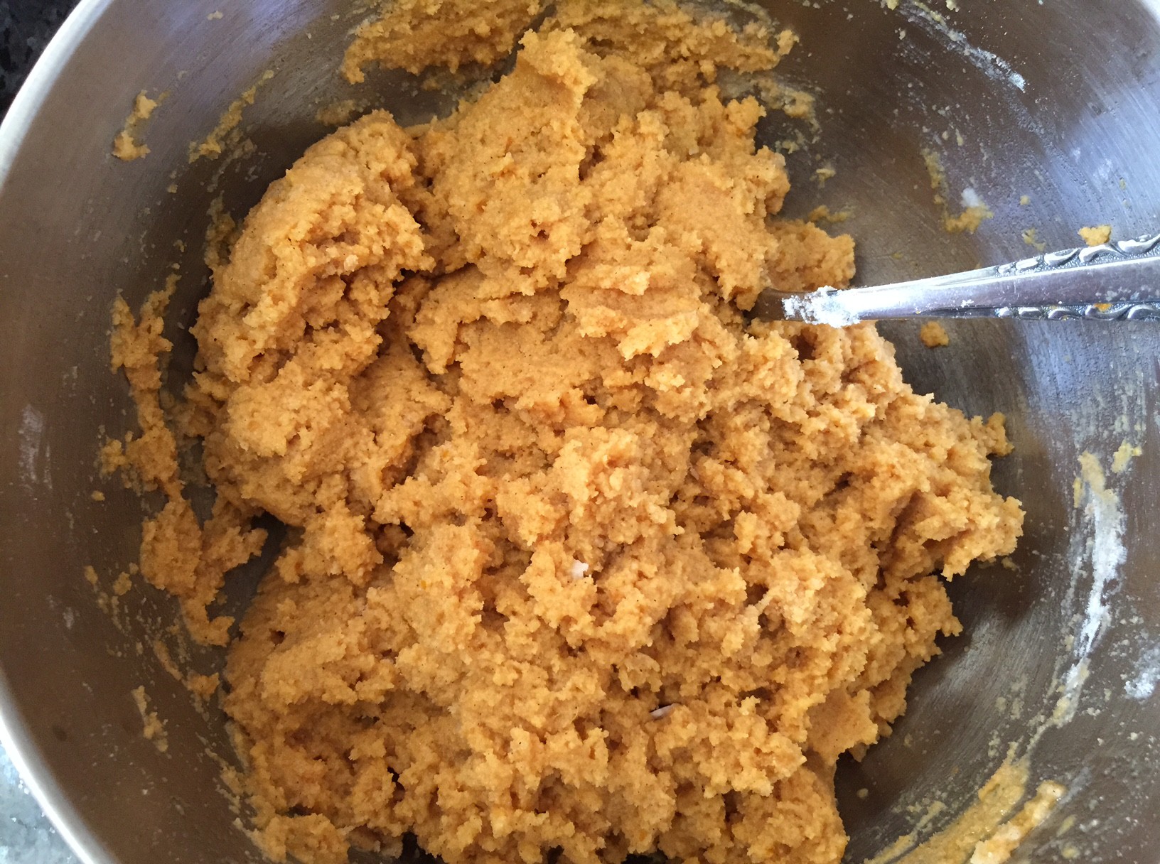 Don’t worry; the batter will be pretty thick. In fact, it had more of a cookie dough consistency at first, which is why I upped the original cup of pumpkin to the whole can.