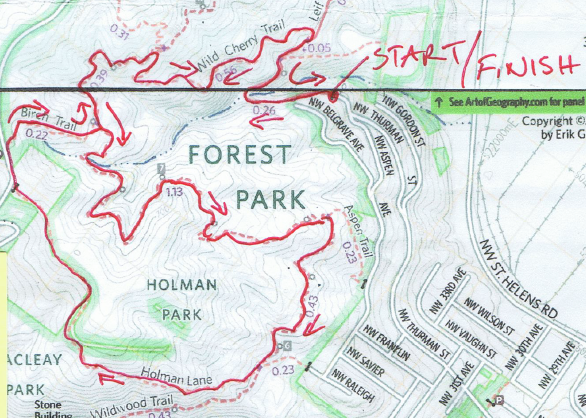 We’d start on Leif Erikson and go up Leif to Wild Cherry, up Wild Cherry to Wildwood, then down Wildwood to Holman, up Holman to 53rd, up 53rd to Birch, down Birch to Wildwood, up Wildwood to Wild Cherry, down Wild Cherry to Leif and Leif to the finish.