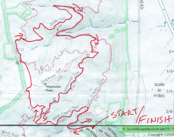 We’d start on Leif Erikson and go up Leif to Wild Cherry, up Wild Cherry to Keil, down Keil to Wildwood, then down Wildwood to Alder, down Alder to Leif, up Leif to Dogwood, up Dogwood to Wildwood, down Wildwood to Wild Cherry, down Wild Cherry to Leif and Leif to the finish.