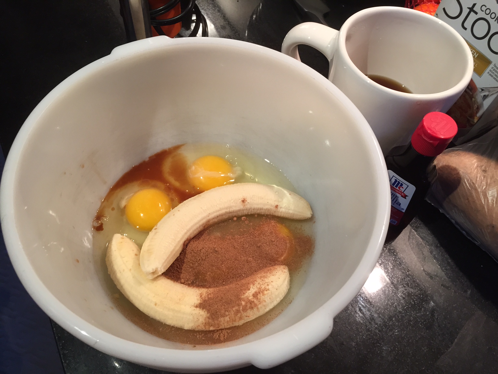 1. Add bananas, eggs, vanilla and pumpkin pie spice to a medium-sized bowl.