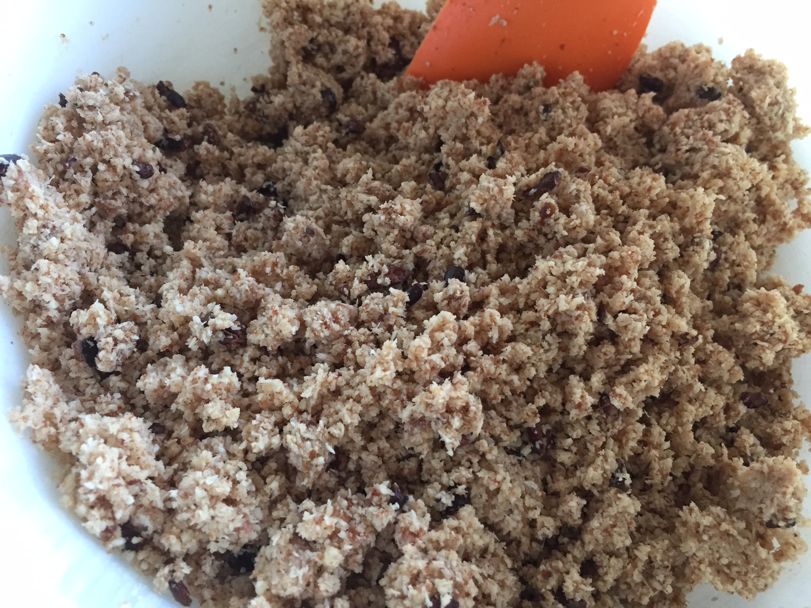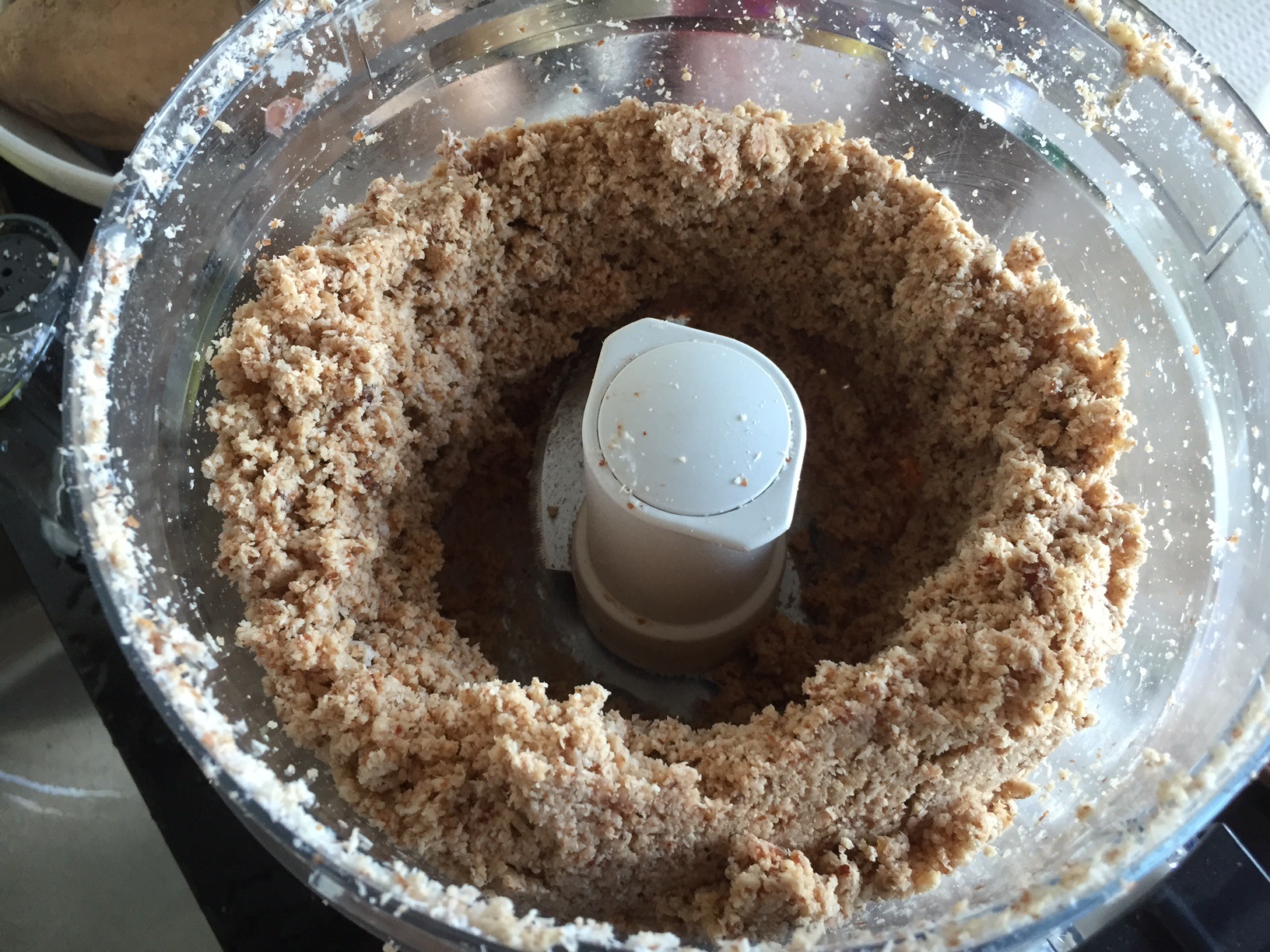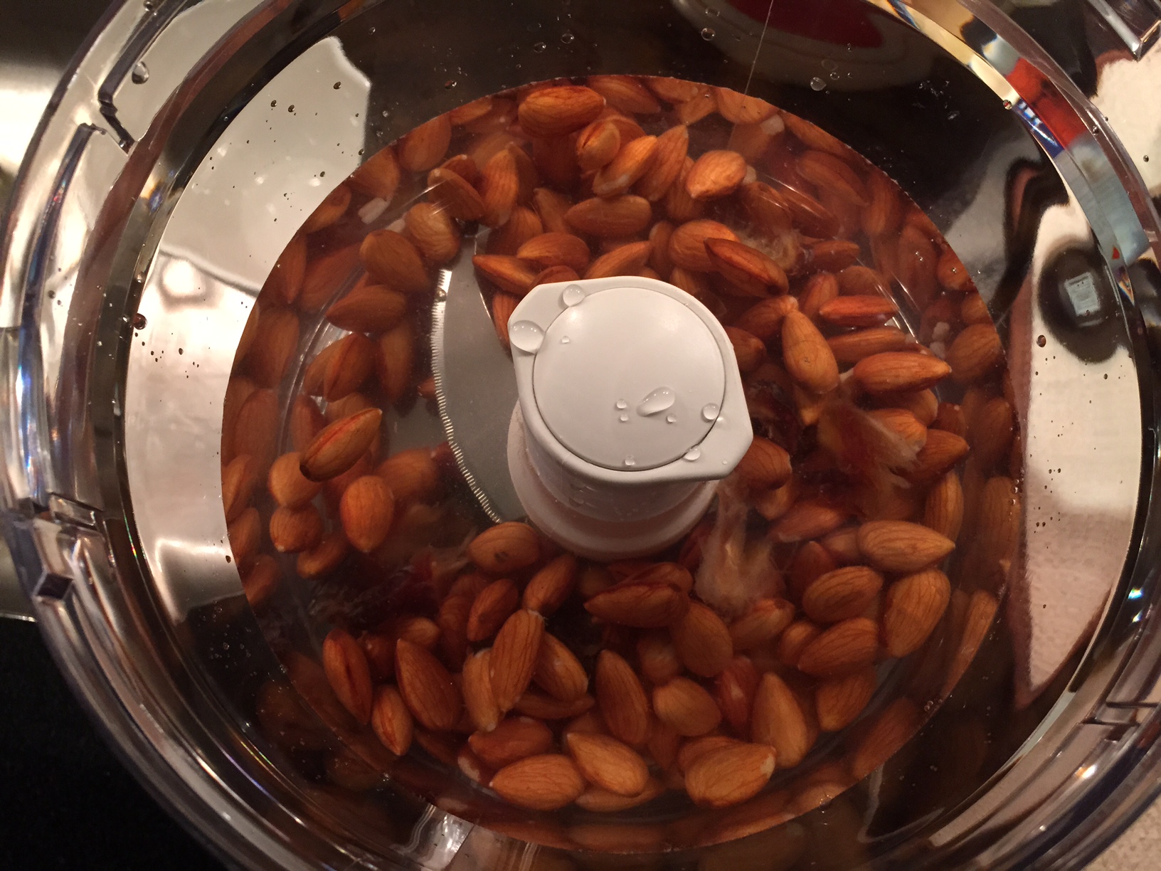 Step three: Rinse almonds and place in food processor with 3-4 pitted dates and a few cups of fresh water. Blend.