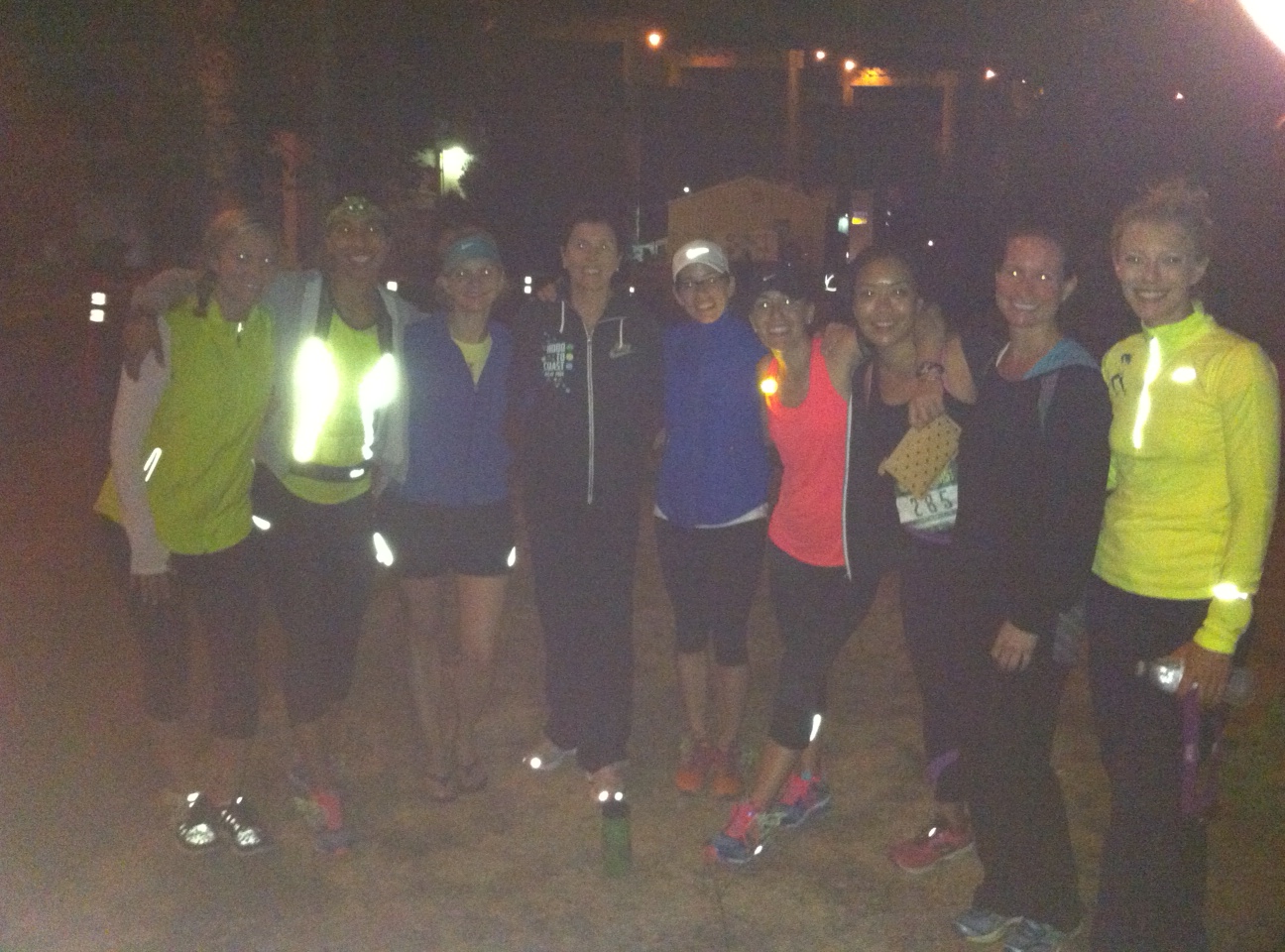 After gearing up in the obligatory headlamp, safety vest and blinking lights (front and back), I queued up with the ladies of Van 2 (above, from left: Mindy, Janelle, Katy and Paige) at the exchange point as we waited for Jen to come in.