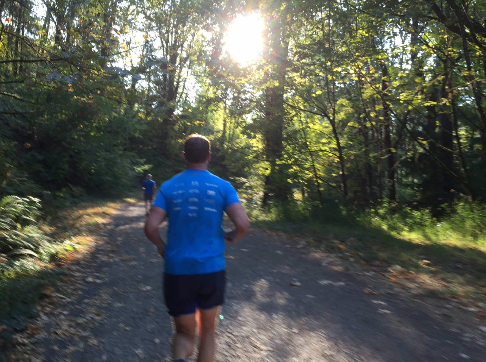Mostly this consisted of me trying to keep up with Ben, so my view looked like this for the better part of race. We got passed by a few people on the hills as I alternated from jogging and hiking up the inclines, but made up some time on the descent and managed to pass a few people on the second half of the course.