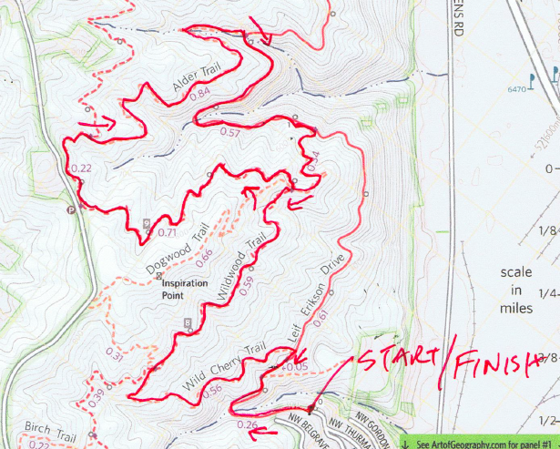 We’d start on Leif Erikson and go up Leif to Wild Cherry, up Wild Cherry to Wildwood, then down Wildwood to Alder, down Alder to Leif, down Leif to Dogwood, up Dogwood to Wildwood, down Wildwood to Wild Cherry, down Wild Cherry to Leif and Leif to the finish.