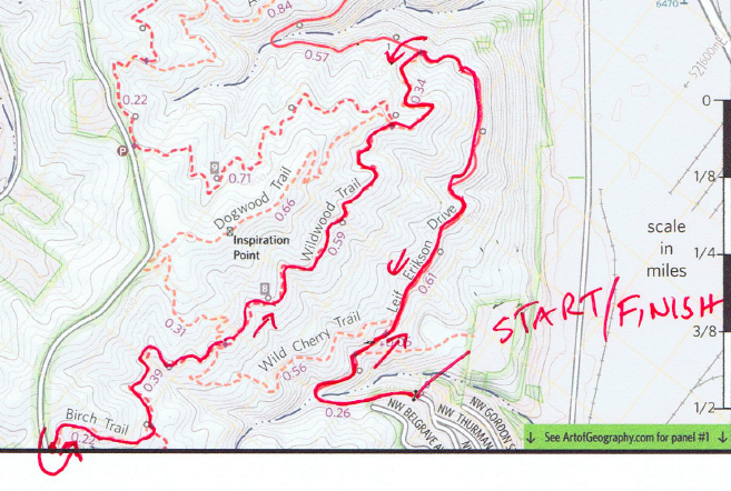 With comfy feet and a full belly, it was time to focus on the task at hand — our out-and-back course of 4.32 miles. We’d start on Leif Erikson and go up Leif to Dogwood, up Dogwood to Wildwood, then up Wildwood to Birch, and up to the top of Birch. Then we’d turn around and return the same way to the finish.