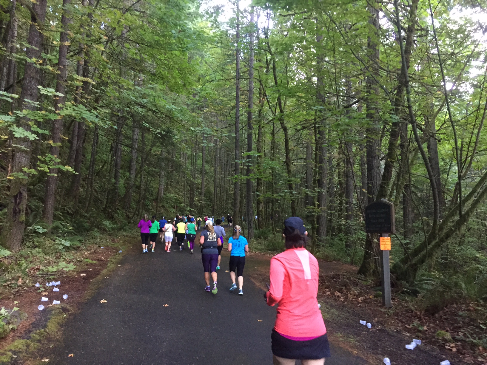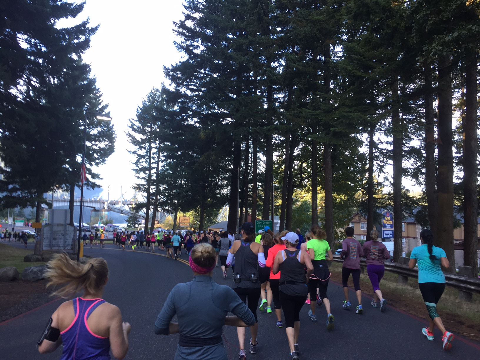 The gun went off for the half marathon at 8 a.m., so we got to watch them take off before our 10k gun went off at 8:15 a.m. There’s a costume contest component, too, so many ladies were clad in togas as they made their way off the bridge down to the Historic Columbia River Highway Trail for an out and back.