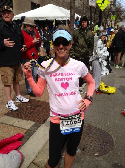 Running the Boston Marathon with a baby on board was really a coincidence, as I had qualified and booked the trip before I knew I was expecting. It had always been a dream to run this race, and relaying that desire to my OBGYN was among the first topics of my first appointment. With everyone’s support — including my husband, who initially thought that this might be too much — I set myself a goal of sub four hours (realistic and challenging enough, but allowing for some fun along the course) and finished feeling strong and healthy.